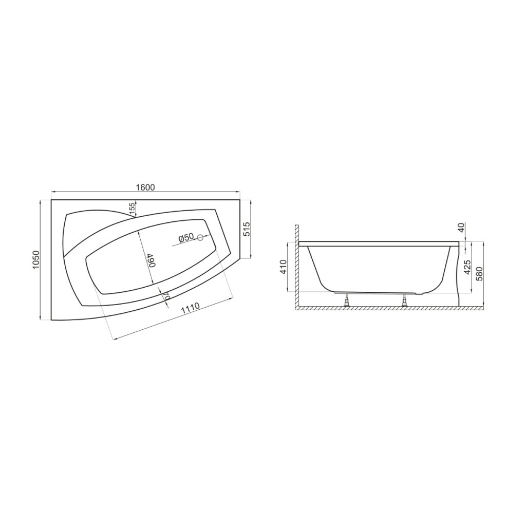 Polimat FRIDA - asymetrická akrylátová vaňa 160x105 cm - bez predného panelu