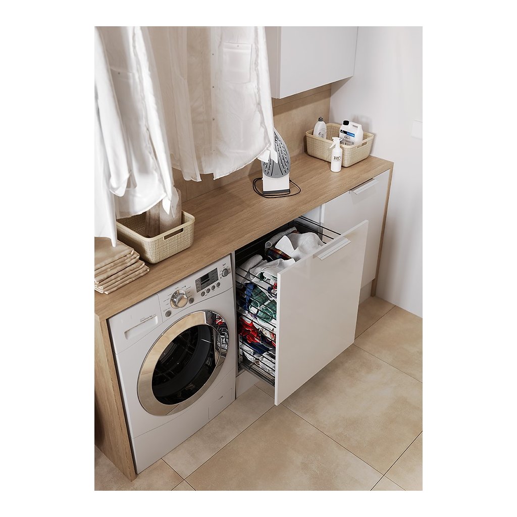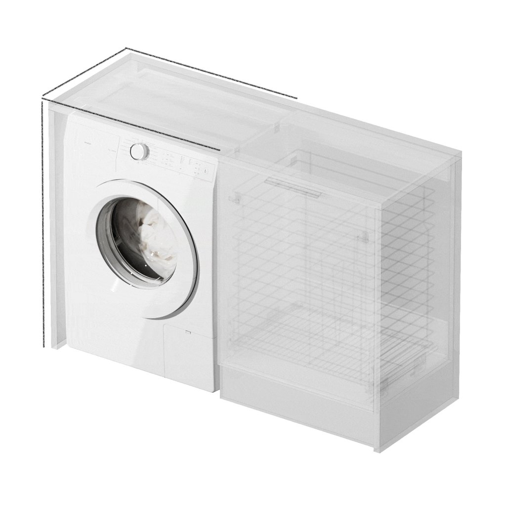 Vstavaná skriňa na práčku s dvierkami sa dokonale hodí k domácim spotrebičom v celkovom dizajne interiéru. Skrinka je vyrobená z bielej drevotriesky.