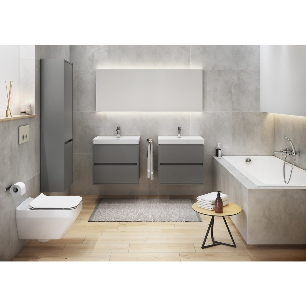 Súčasťou zostavy je závesná umývadlová skrinka CREA 60 s nábytkovým umývadlom CREA 60. Čelo a korpus skrinky sú vyrobené z drevotriesky odolnej voči vlhkosti. Skrinka má pohodlné frézované úchytky a systém tichého zatvárania ako aj dve priestranné zásuvky. Interiér so sivou ľanovou štruktúrou dodáva skrinke dodatočný elegantný vzhľad. Zatváranie šuplíkov je na samospomaľovacom systéme soft-close.