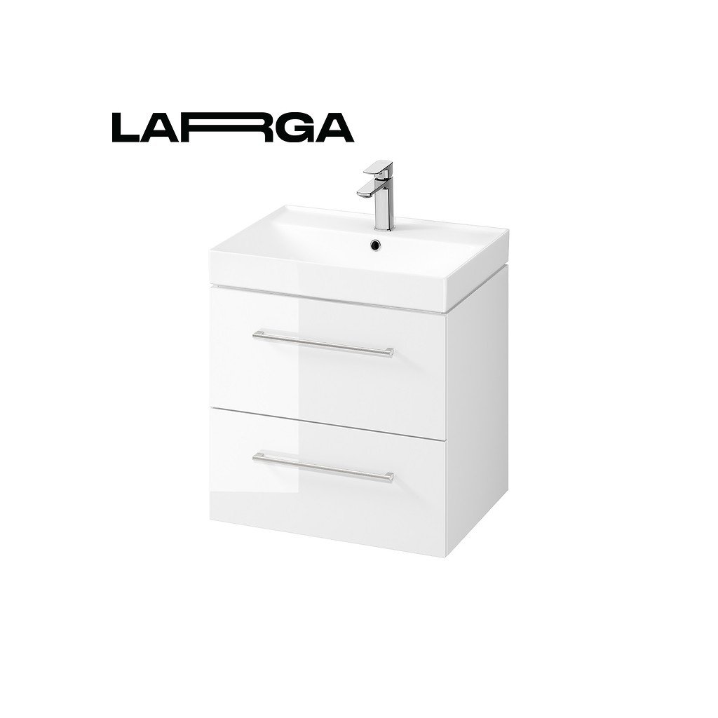 Súčasťou zostavy je závesná umývadlová skrinka LARGA 60 s nábytkovým umývadlom LARGA 60. Čelo a korpus skrinky sú vyrobené z lakovanej dosky. Skrinka je vybavená systémom tichého zatvárania (tzv. SOFT CLOSE) a dvoma priestrannými zásuvkami. Možnosť dokúpiť samostatne vrúbkované rúčky a ozdobné nožičky v 3 farbách (strieborná, zlatá a čierna). Umývadlo LARGA je vyrobené z keramickej hmoty ROCKLITE, vďaka čomu je odolné, ľahké a s extrémne tenkými stenami.