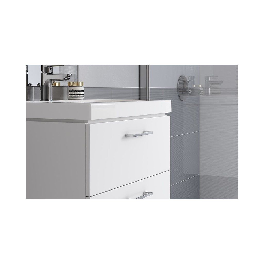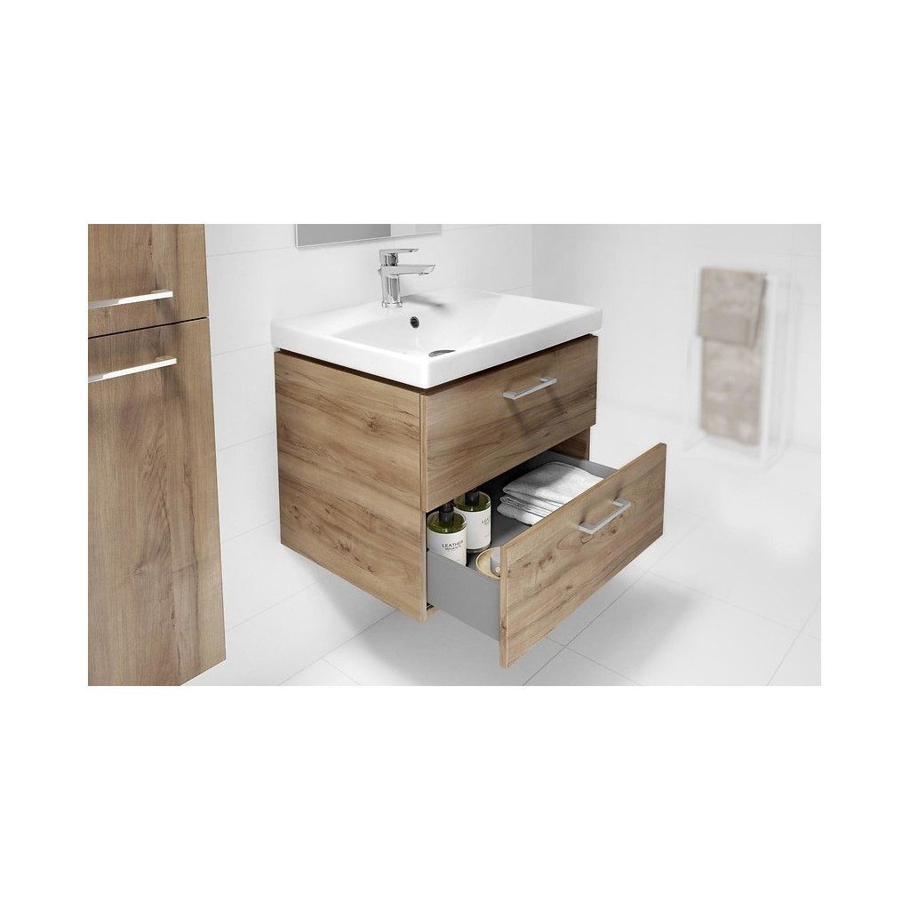 Súčasťou zostavy je závesná umývadlová skrinka CERSANIT LARA orech 50 s umývadlom CITY 50, Čelo a korpus skrinky sú vyrobené z drevotriesky 16 mm. Skrinka má dve priestranné zásuvky s tichým zatváraním. Šuplíky sú vybavené s chrómovými úchytkami.