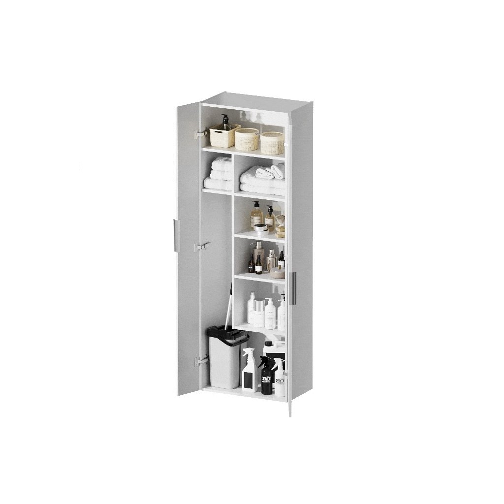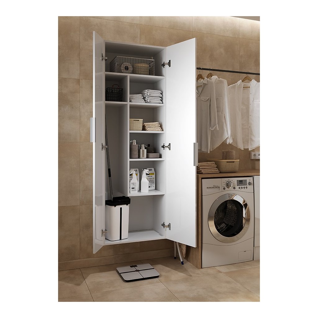 Multifunkčný kúpeľňový stĺp Vám umožní uložiť uteráky a čistiace prostriedky, no to nie je všetko. Vďaka regulácii políc (3 malé a 5 veľkých) sa do nej zmestia vysoké doplnky do domácnosti, ako je mop s vedierkom alebo žehliaca doska. Čelo a korpus skrine sú vyrobené z lakovanej drevotriesky. Dvere stĺpa sú vybavené „pomalým zatváraním“ soft-close.