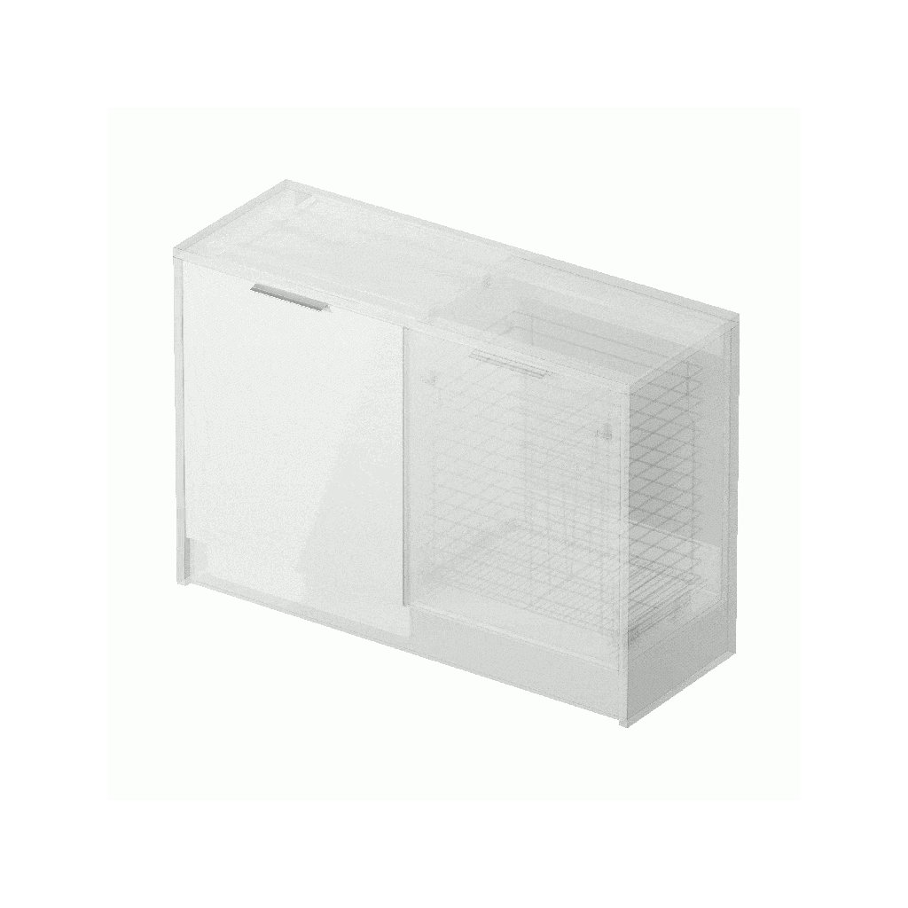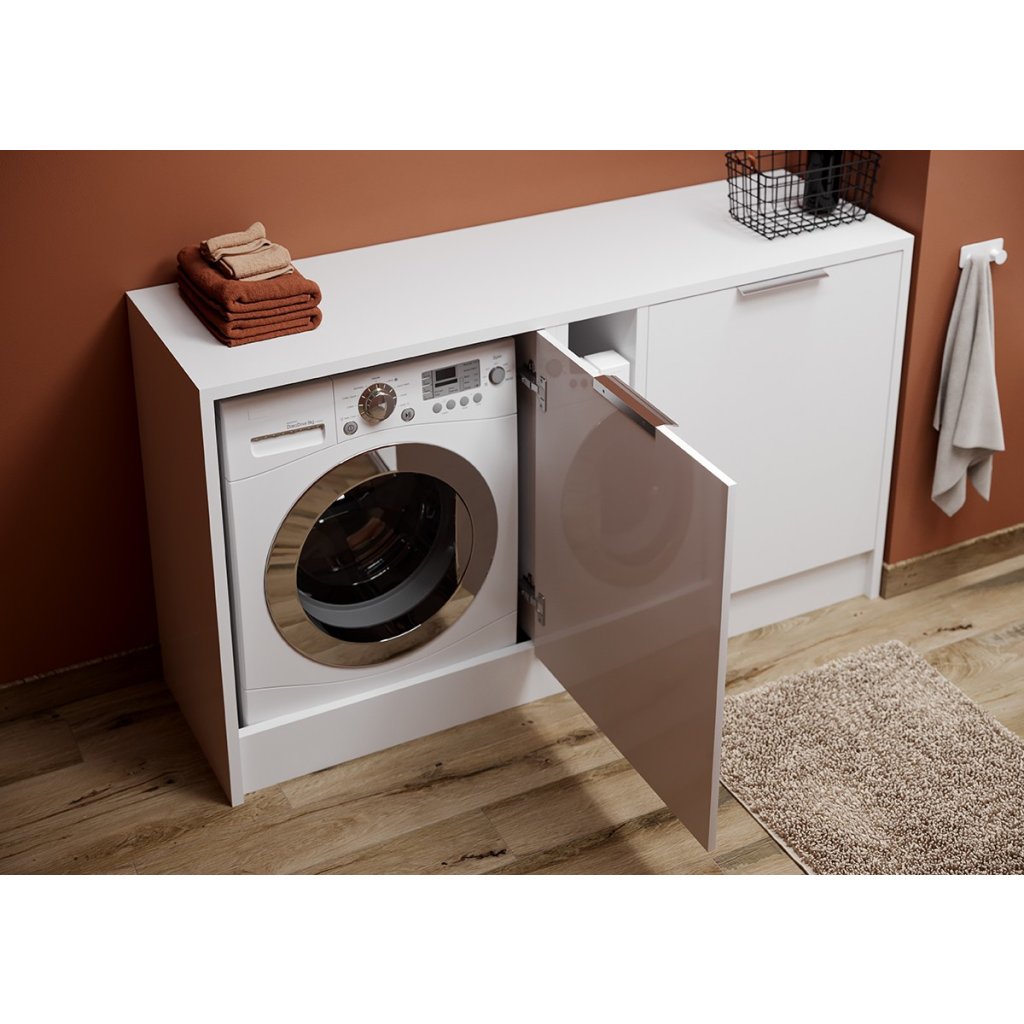 Vstavaná skriňa na práčku s dvierkami sa dokonale hodí k domácim spotrebičom v celkovom dizajne interiéru a esteticky ju skryje za dvierkami nábytku. Skrinka je vyrobená z bielej drevotriesky. Je možné dokúpiť čierne alebo strieborné úchytky