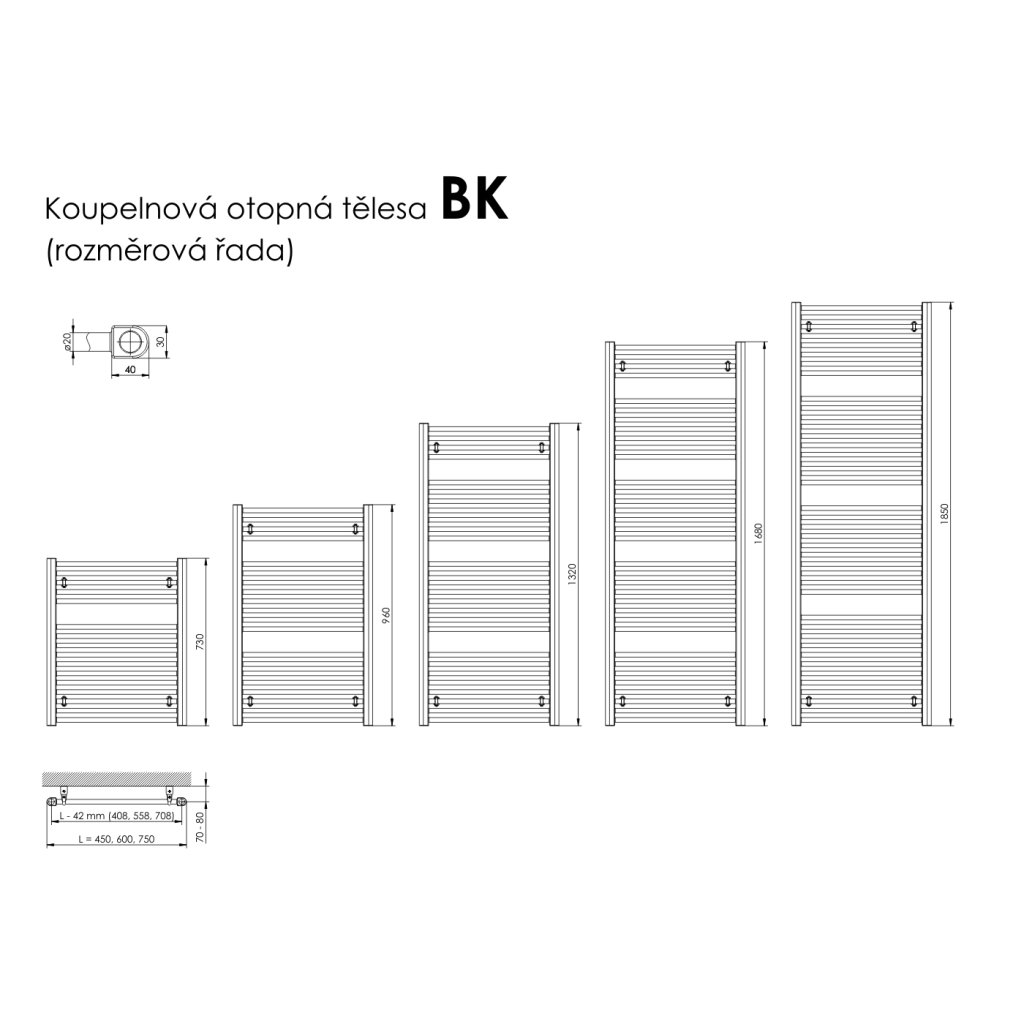 Kúpeľňové vykurovacie teleso BK je najpoužívanejším typom kúpeľňových rúrkových radiátorov. Je vyrobené z priečnych oceľových rúrok s priemerom 20 mm a dvoch vertikálnych oceľových stojin v tvare D o rozmere 30 x 40 mm. Rozmerový rad začína dĺžkou 450 mm, maximálna dĺžka je 750 mm, výška od 730 mm až 1850 mm. Základné rúrkové vykurovacie teleso BK dodávame v bielej komaxitovej farbe RAL 9016. Súčasťou dodávky kúpeľňového rúrkového radiátora je sada na upevnenie na stenu aj odvzdušňovacia a zaslepovacia zátka.