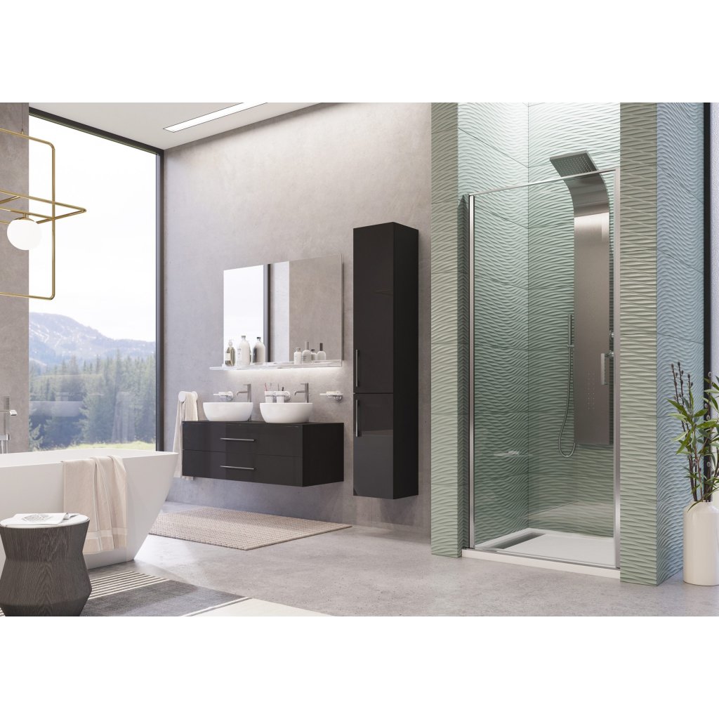 Univerzálne sprchové dvere jednokrídlové ktoré je možné otvárať do priestoru kúpeľne alebo do vnútra niky. Sprchové dvere sú vybavené tvrdeným bezpečnostným sklom ktoré je vsadené do rámu s vysokým chrómovým leskom. Výplň sprchových dverí je z číreho alebo nepriehľadného (grapé) skla sú ošetrené antiplakovou impregnáciou TEKNO.cal. Rám sprchových dverí je aj na hornej a dolnej časti sprchových dverí.