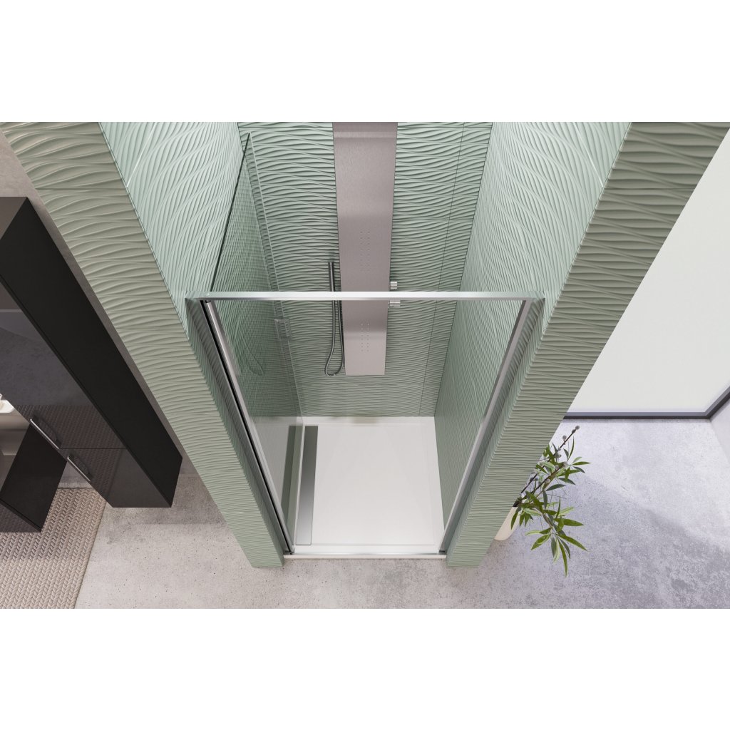 Univerzálne sprchové dvere jednokrídlové ktoré je možné otvárať do priestoru kúpeľne alebo do vnútra niky. Sprchové dvere sú vybavené tvrdeným bezpečnostným sklom ktoré je vsadené do rámu s vysokým chrómovým leskom. Výplň sprchových dverí je z číreho alebo nepriehľadného (grapé) skla sú ošetrené antiplakovou impregnáciou TEKNO.cal. Rám sprchových dverí je aj na hornej a dolnej časti sprchových dverí.