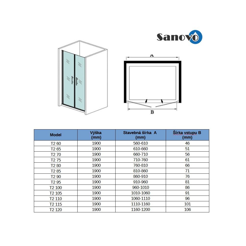 Sprchové dvere Sanovo T1 85 sú jednokrídlové dvere, ktoré sa mechanicky otvárajú do vonkajšej strany do priestoru Vašej kúpeľne. Samotnú výplň dverí tvorí tvrdené bezpečnostné kalené sklo s hrúbkou 6 mm, ktoré je po bočných stranách vsadené do elegantného AL rámu s výbornou leštiteľnosťou a protikoróznou odolnosťou.