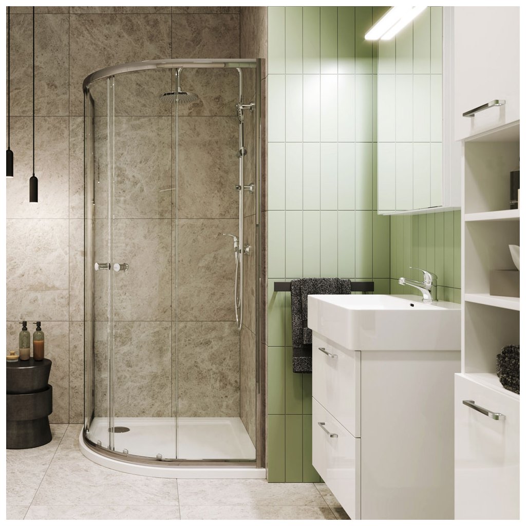 Kúpeľňová skrinka v bielom prevedení s keramickým dizajnovým umývadlom.