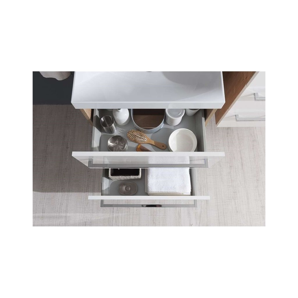 Jednoduchosť, efektívnosť, elegancia. To sú hlavné spoločné menovatele kúpeľňového nábytku Bino, ktorý ozdobí každú kúpeľňu. Vďaka kombinácii inovácií a spoľahlivého prístupu, potom vzniká kvalitný a zároveň veľmi moderný nábytok. Farebné kombinácie biely lesk, biely lesk + dub zaisťujú, že bude nábytok ladiť do každého typu kúpeľne. Užívateľsky veľmi praktické sú potom dve plnovýsuvné zásuvky so samozatváracími pojazdmi a tlmením Strong. Skrinka sa dodáva v zloženom stave.