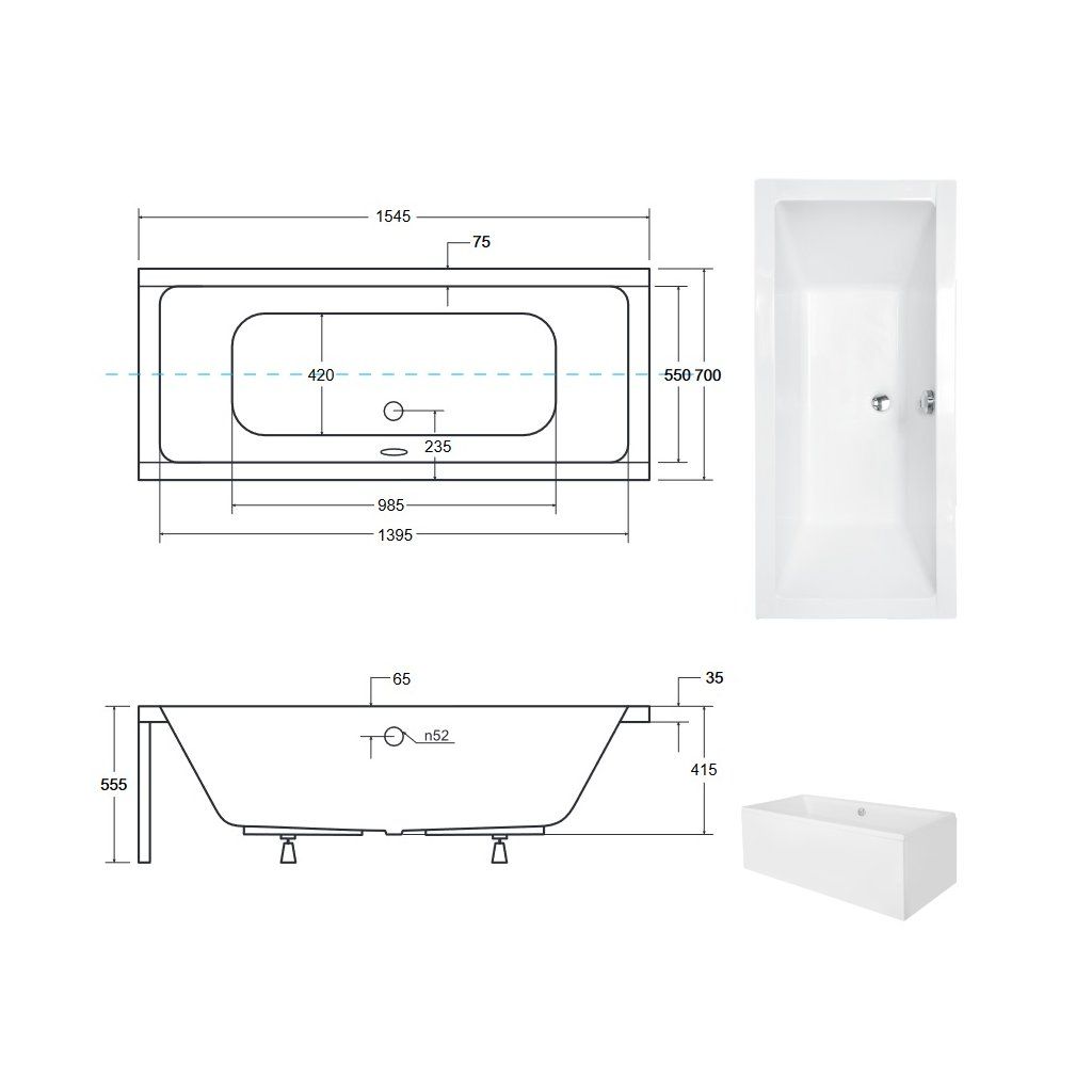 Obdĺžniková akrylátová vaňa Besco QUADRO 155x70 cm (#WAQ-155-PK)