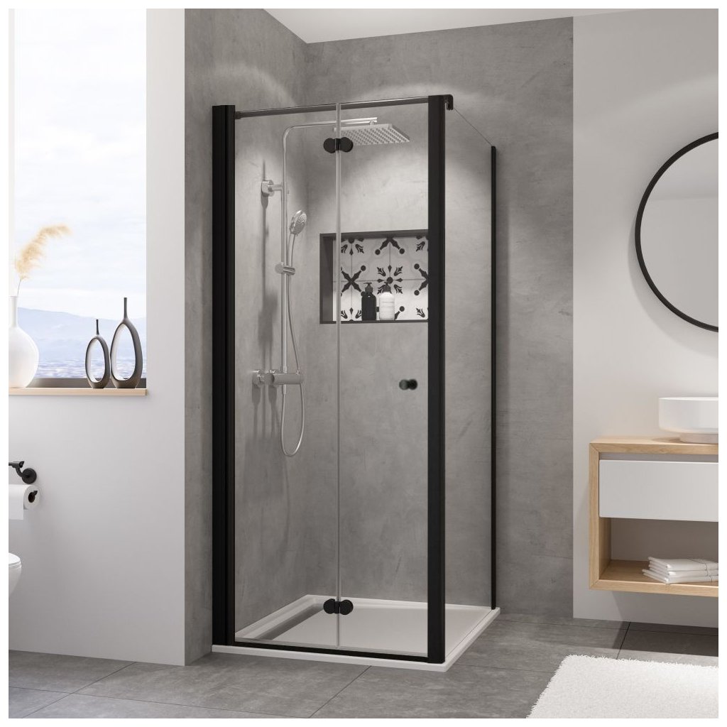 Zalamovacie sprchové dvere sú praktické pre ich otváranie. Ľahko sa dajú zaklopiť a otáčať až o 360°. Sprchové dvere disponujú zdvíhacím pántom pre ich ľahké otváranie. Rám je vyrobený z kvalitného hliníka v čiernom prevedení.