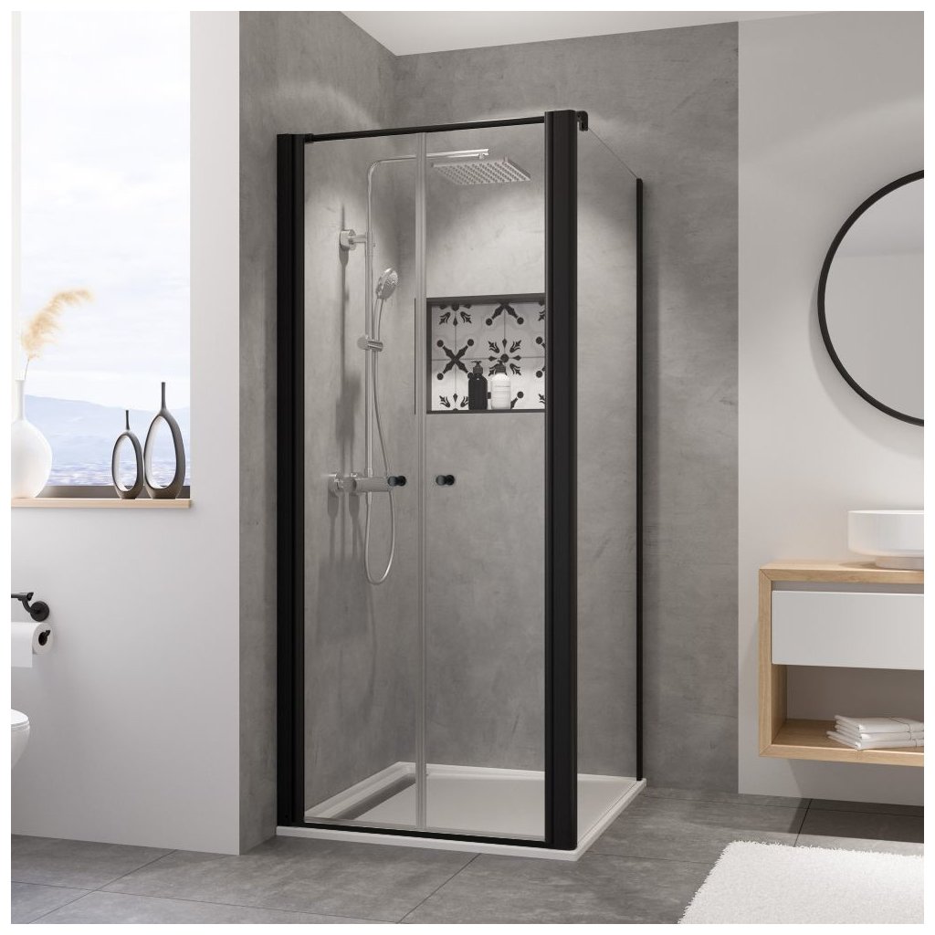 Štvorcový sprchový kút Sanovo T2 kombi 80x80x190 cm s čiernym rámom.