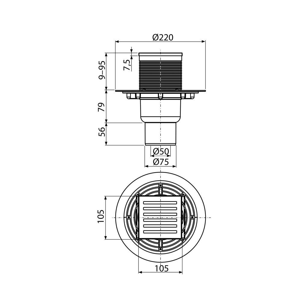 Podlahová vpusť 105×105/50/75 mm priama