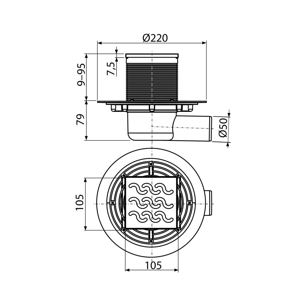 Podlahová vpusť 105×105/50 mm bočná APV102