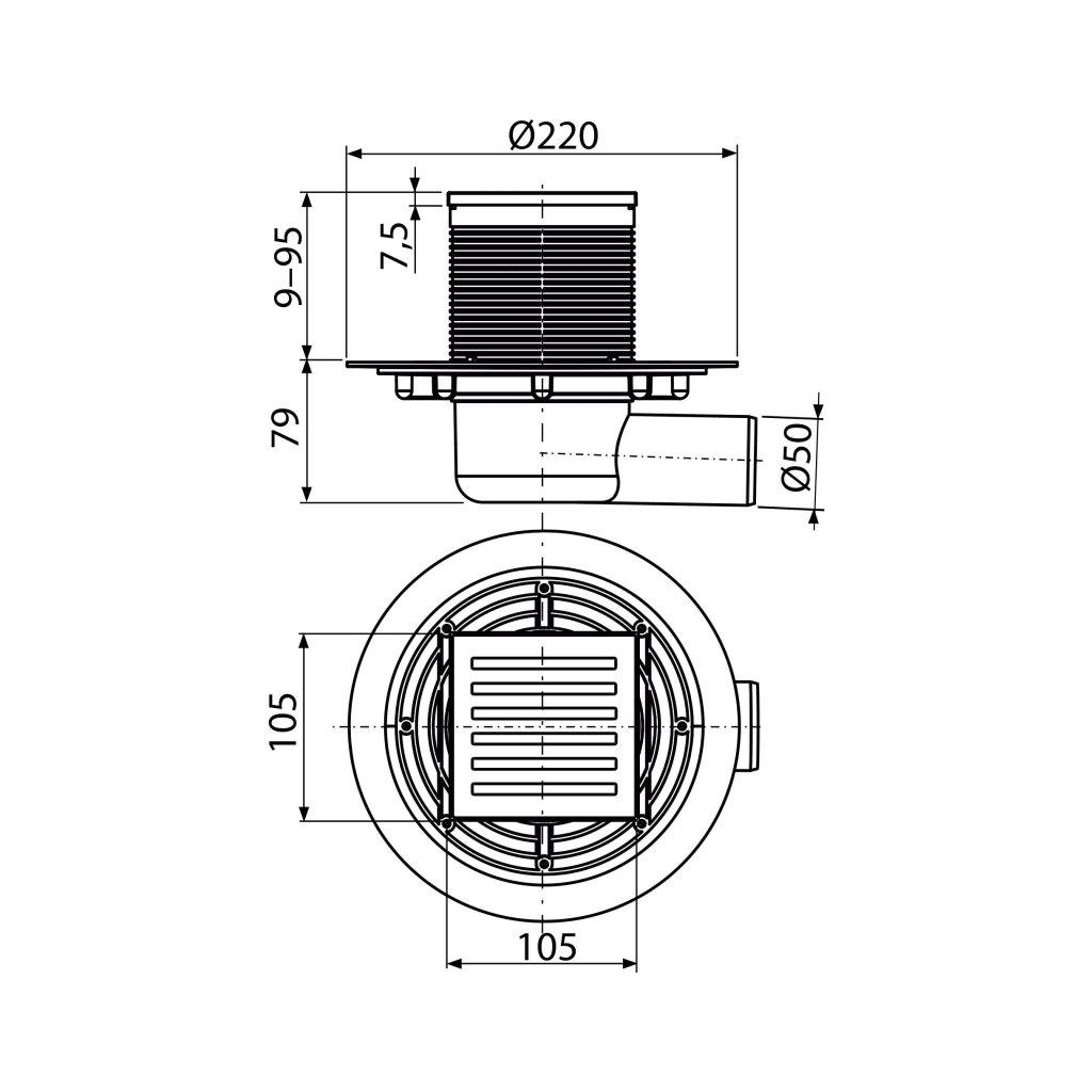 Podlahová vpusť 105×105/50 mm bočná APV103