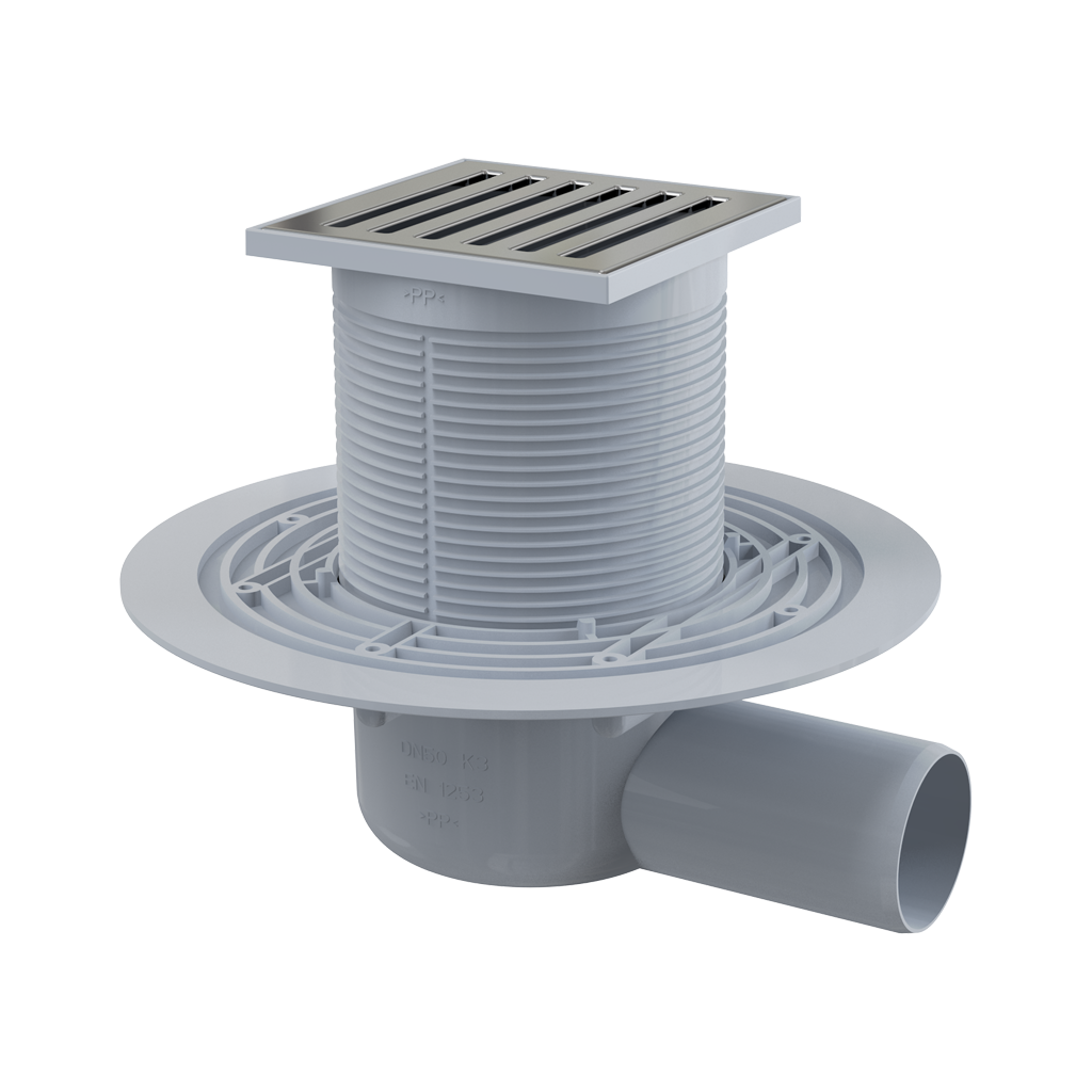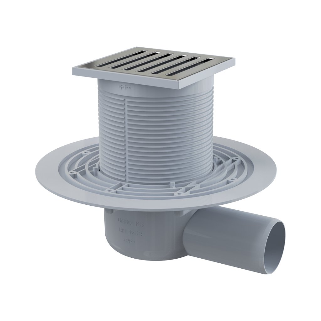 Podlahová vpusť 105×105/50 mm bočná, mriežka nerez, vodná zápachová uzávera (APV103)