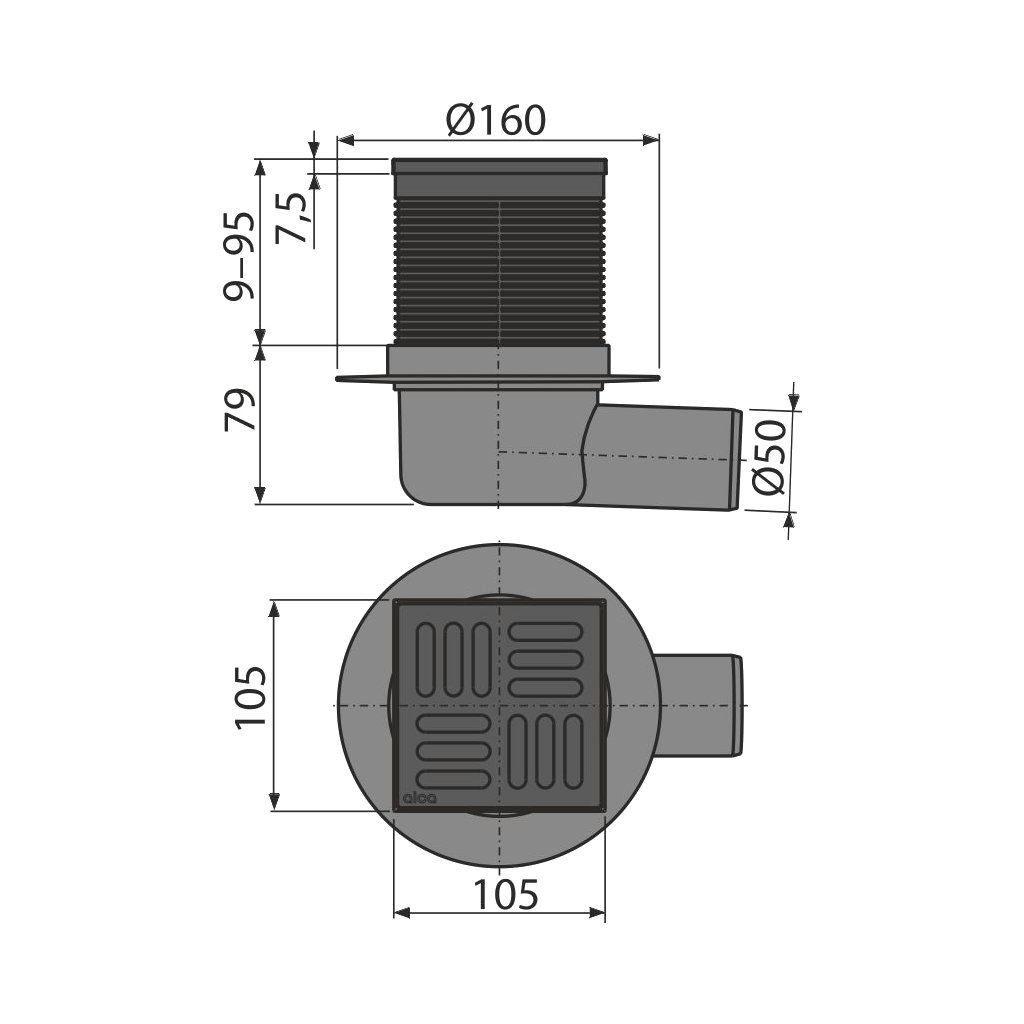 Podlahová vpusť 105×105/50 mm bočná, farba mriežky čierna matná