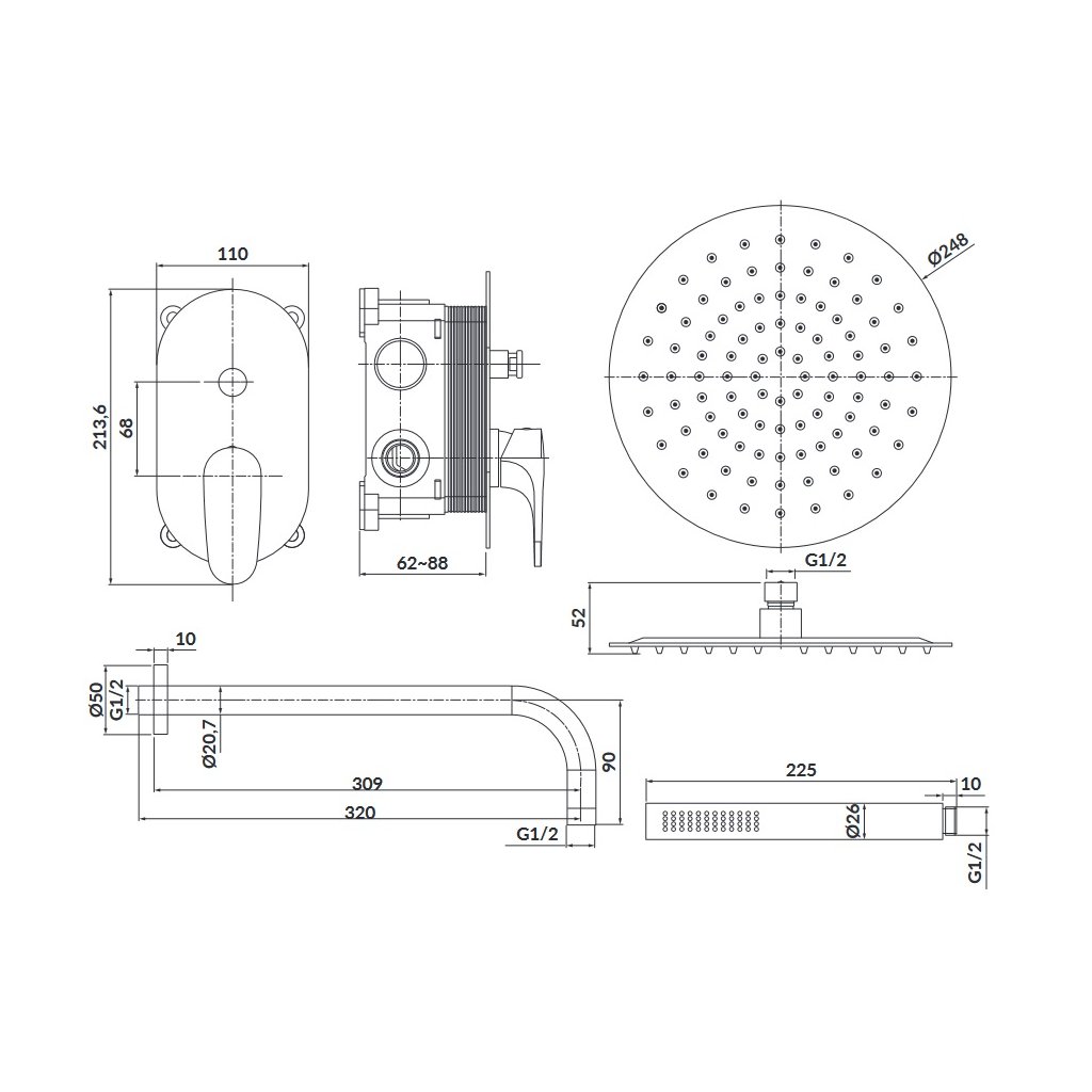 Sada INVERTO obsahuje: vaňovú a sprchovú batériu, dažďovú sprchu SLIM (0,2 cm) s priemerom 25 cm z nehrdzavejúcej ocele so silikónovou úpravou Cersanit EasyCLEAN, 1-funkčnú sprchovú rukoväť s priemerom 2,4 cm, PVC sprchová hadica s dĺžkou 150 cm (certifikát WRAS) a tyčou s posuvnou rukoväťou (nerezová oceľ), dlhá 75 cm s posuvnou rukoväťou a uhlovým pripojením. Podomietková časť kovania je moderným riešením v podobe krabice, ktorá sa jednoducho inštaluje a vymieňa.