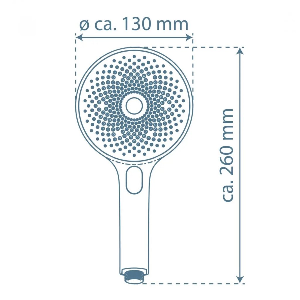 Elegantná wellnes ručná sprcha. Sprchová hlavica s integrovaným tlačidlovým prepínačom pre pohodlné nastavenie typu prúdu. Sprchová hlavica s gombíkmi proti vodnému kameňu pre ľahké odstránenie zvyškov vodného kameňa