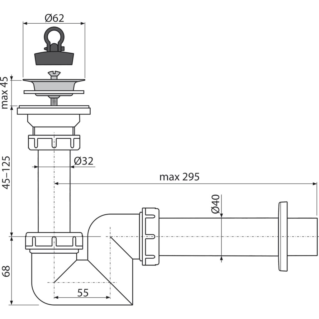 Sifón umývadlový „S“ DN40 s nerezovou mriežkou DN63 (A412-DN40)