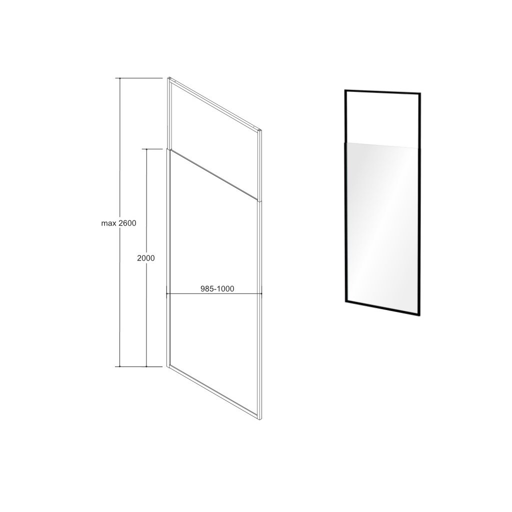 Výplň sprchovej zásteny je 8 mm hrubé kalenné sklo ktoré je vložené do čierneho matného rámu. Vrchná časť rámu sa vyťahuje až po strop v kúpeľni. Maximálna výška konzoly je do 260 cm. Sklo je ošetrené povrchovou úpravou pre ľahšie čistenie ProClean class.
