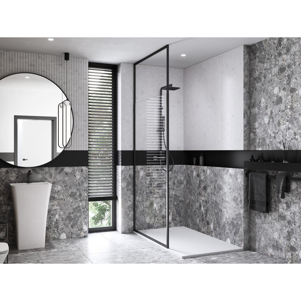 Sklenená zástena walk in do kúpeľne v čiernom prevedení Besco Icon.
