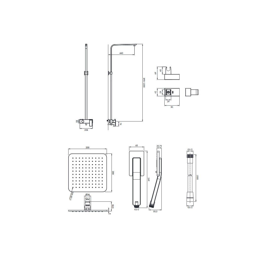 - nastaviteľná výška, minimálna/maximálna výška sprchové setu: 89 cm/130 cm