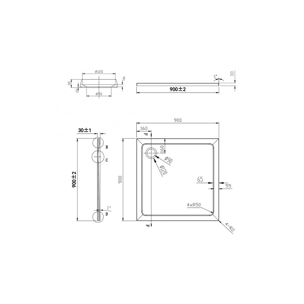 Štvorcová sprchová vanička STAR 90x90cm z liateho mramoru
