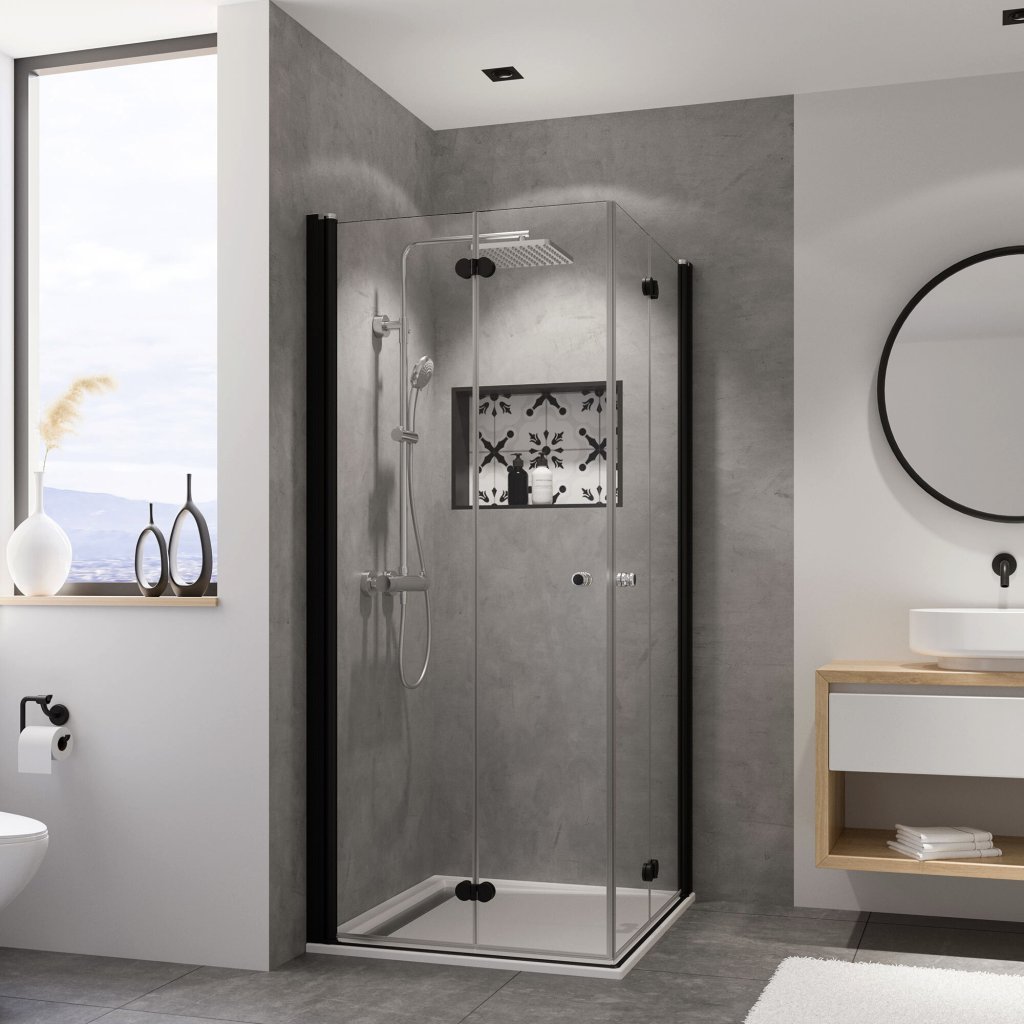 Štvorcový sprchový kút Sanovo Mystery so zalamovacími sprchovými dverami v čiernom prevedení.