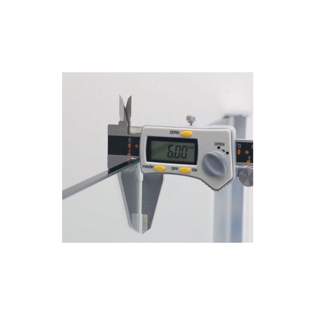 Sklo sprchovej zásteny je zhotovené z bezpečnostného transparentného skla s hrúbkou 6 mm, ktoré je vsadené do lešteného hliníkového rámu s povrchovou úpravou chrómu v lesklom prevedení a uzatváranie dverí je na magnetický spôsob.