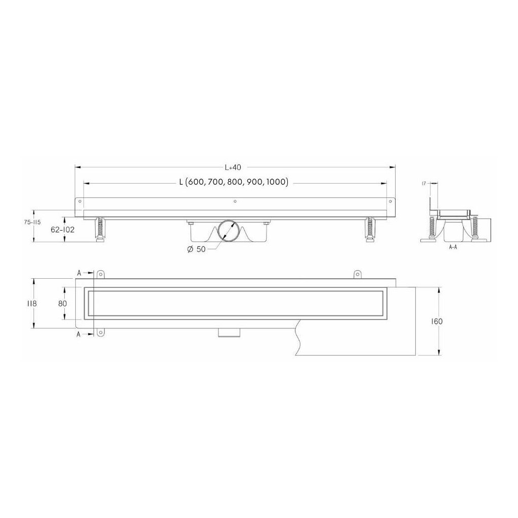 Montážne nožičky: súčasťou (vďaka nastaviteľnej výške žľabu je možné jednoducho namontovať odtok do podlahy ľubovoľnej výšky výtoku).