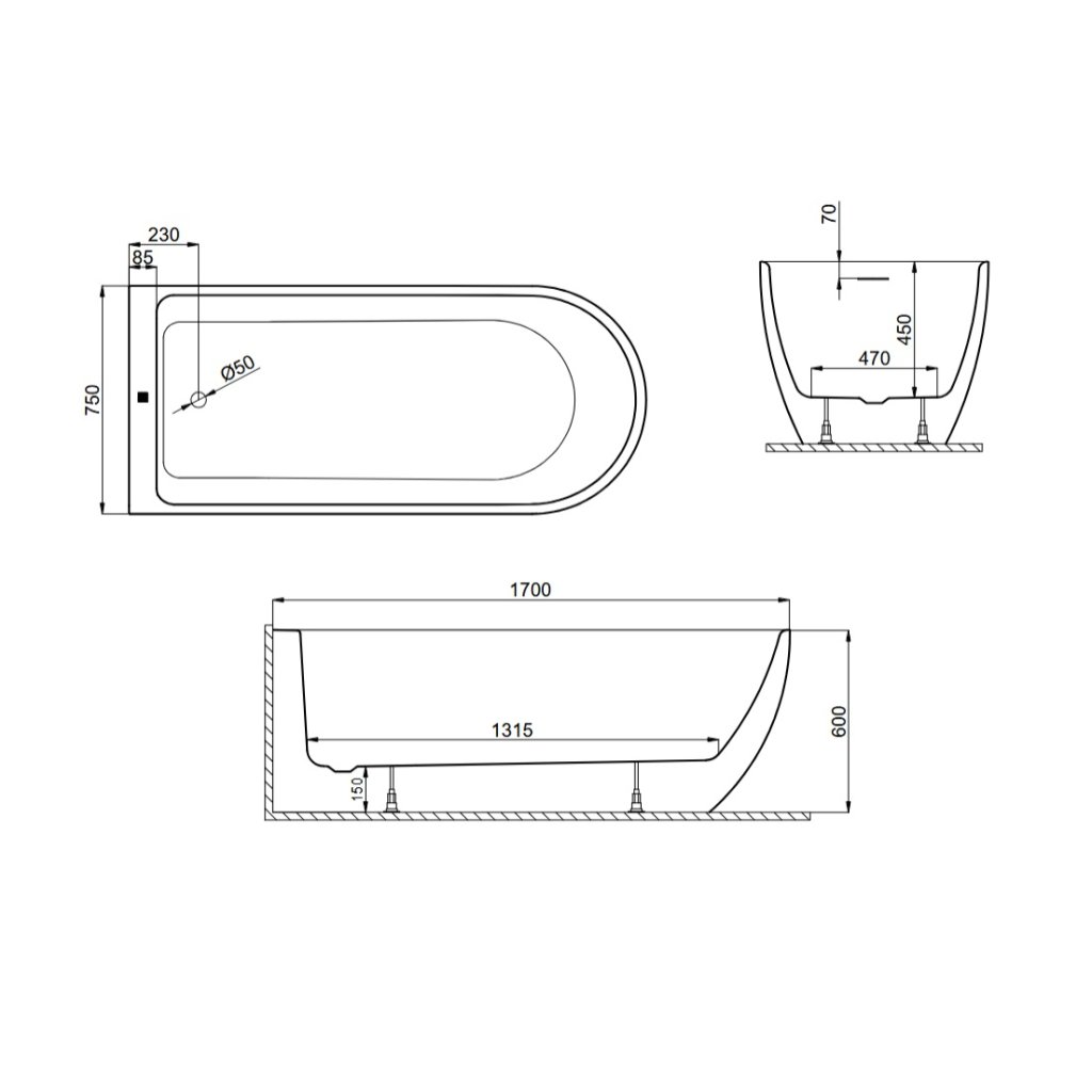 Samostatne stojaca rohová vaňa MURENA 170 cm x 75 cm / čierna matná