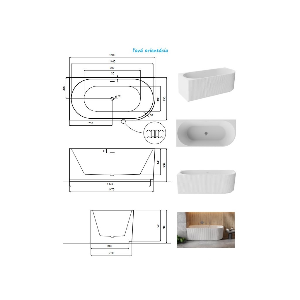 Voľne stojaca vaňa sa vyznačuje veľkým dizajnom a moderným vzhľadom. Tvar a dizajn sa vyznačuje ryhovanou textúrou ktorá je čoraz väčším hitom v kúpeľni.