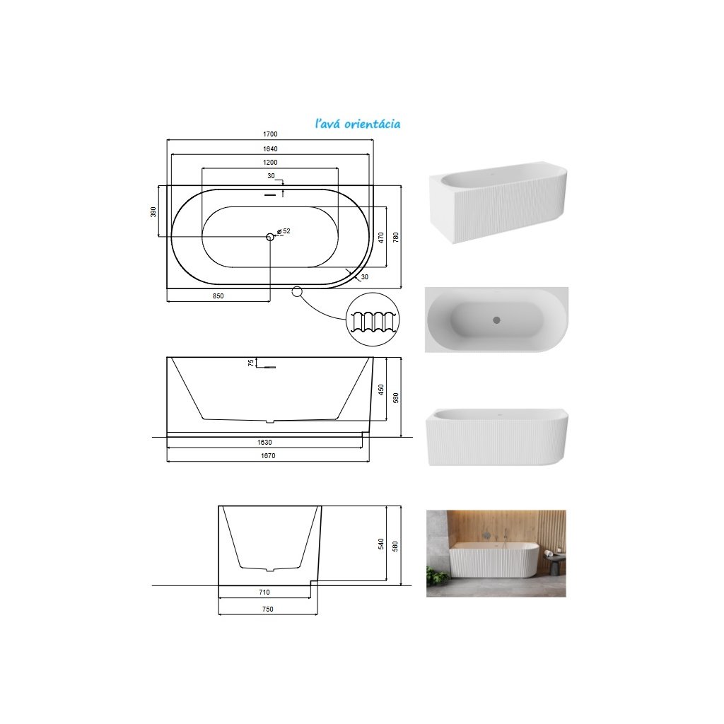 Voľne stojaca vaňa sa vyznačuje veľkým dizajnom a moderným vzhľadom. Tvar a dizajn sa vyznačuje ryhovanou textúrou ktorá je čoraz väčším hitom v kúpeľni.