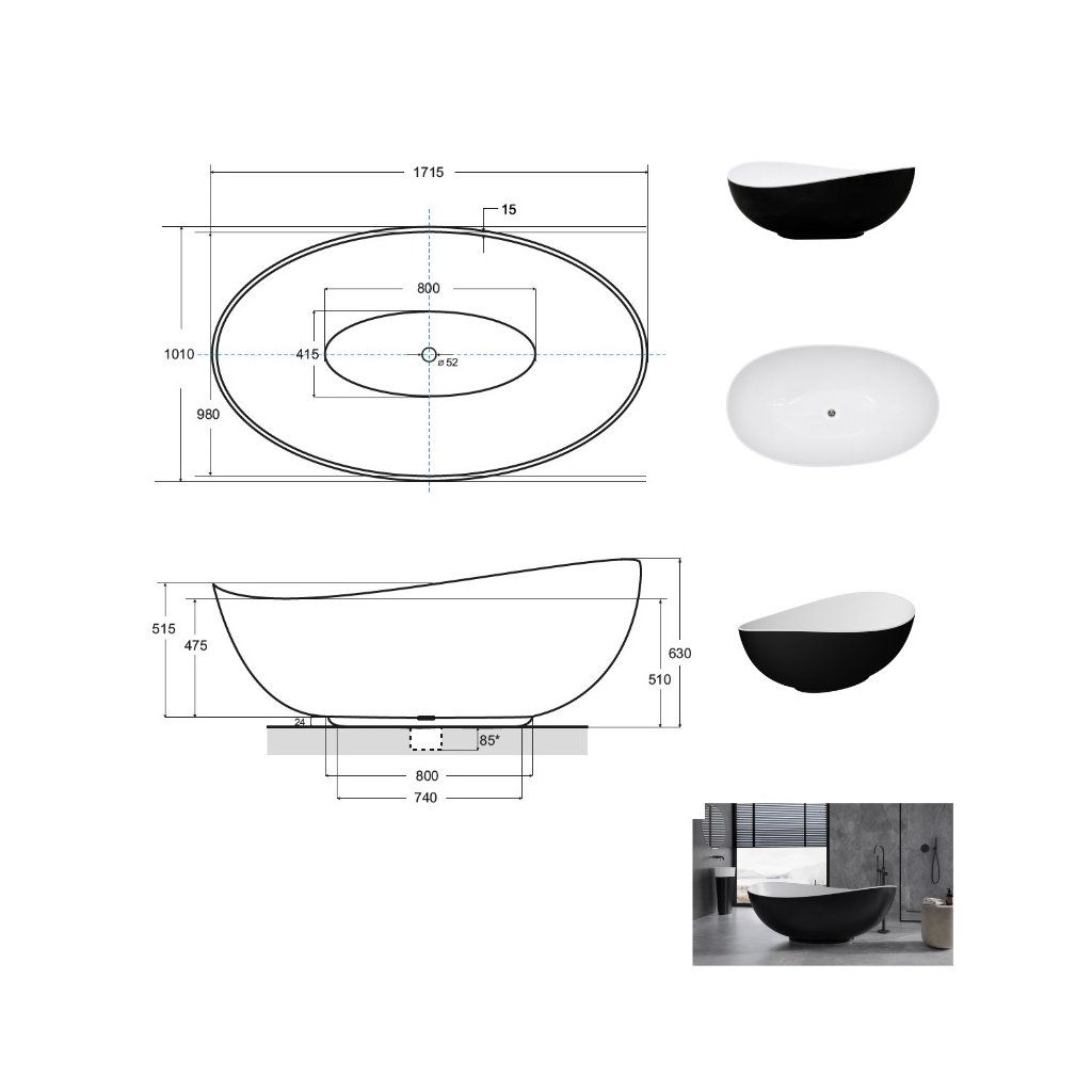 - povrchová úprava vane MATT pokrýva vonkajšiu časť modelu; lesklé vo vnútri.